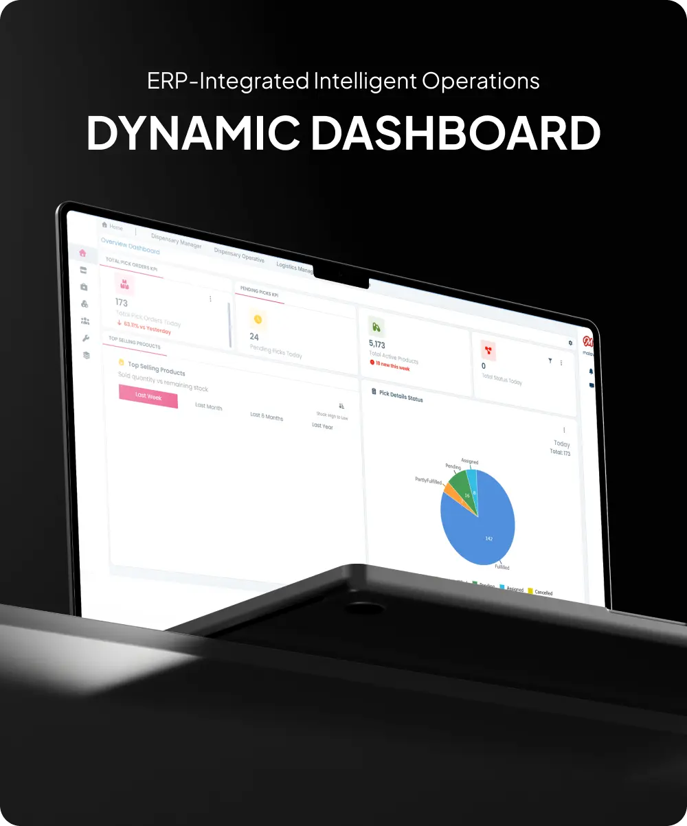 - Real-Time KPI Monitoring: Live tracking of total orders, pending picks, fulfilled orders, and daily operational metrics.